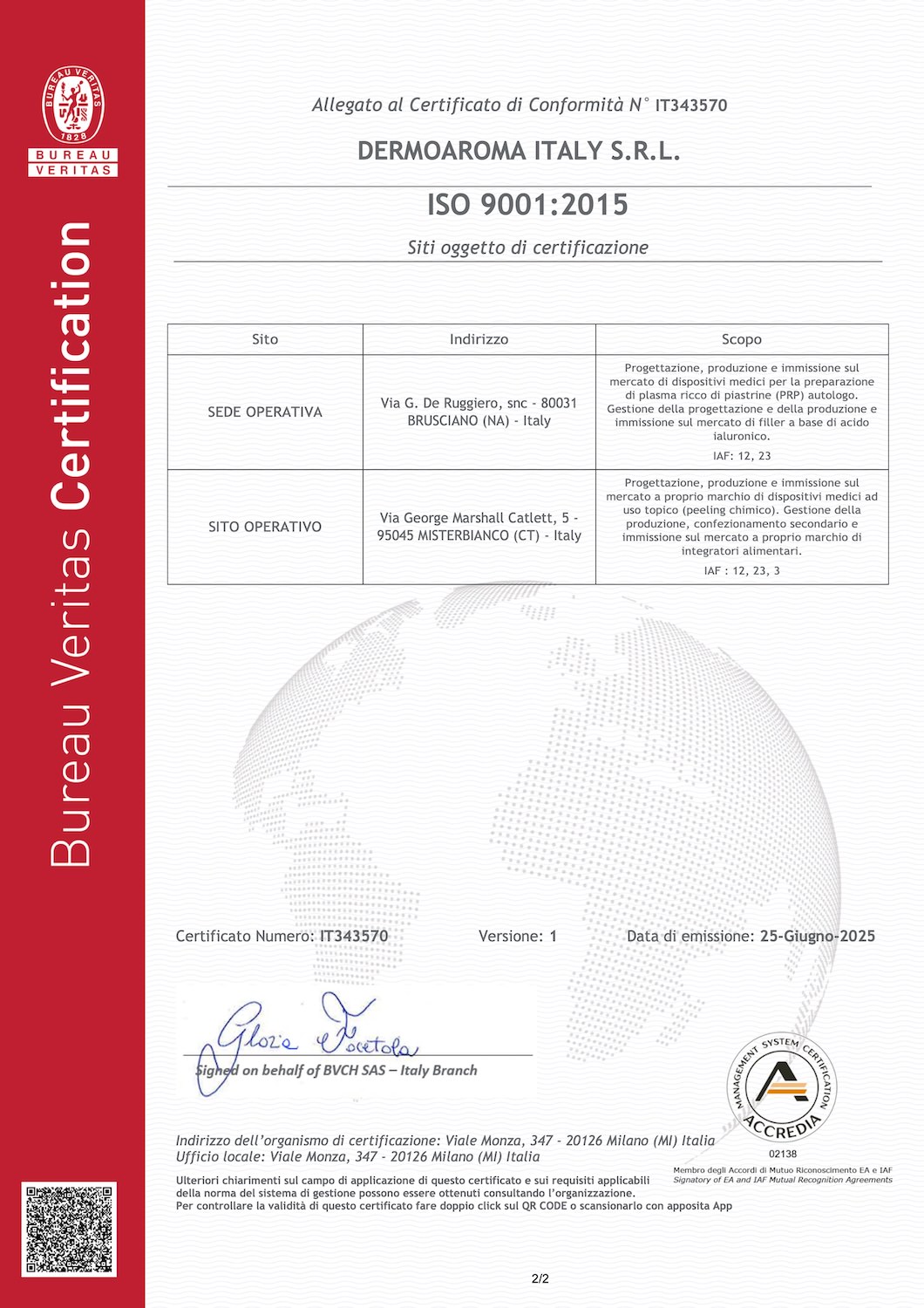 Certificate IT343570 – DERMOAROMA ITALY SRL – ISO9001 – VER ITA 2